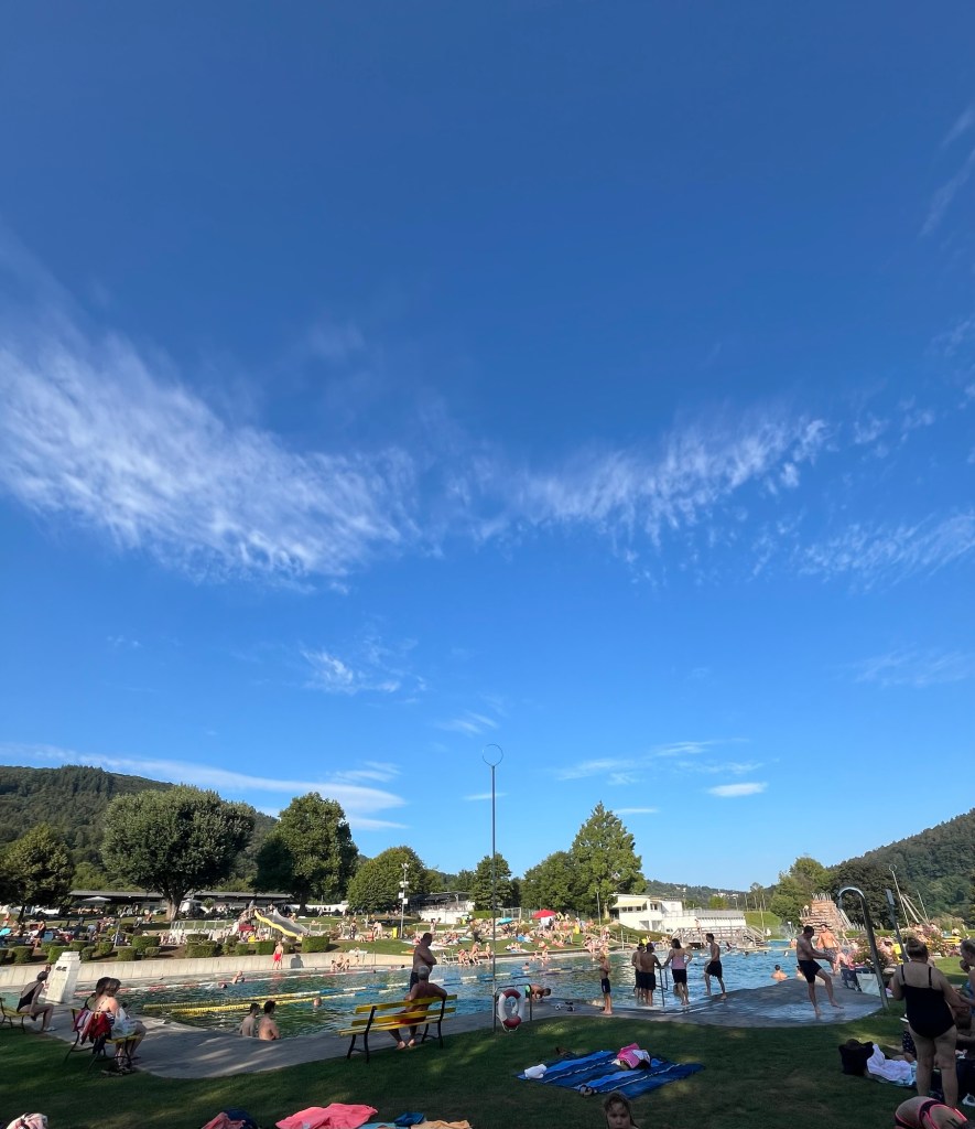 Donc, ma survie de mammifère étant nettement mise en danger, par ces températures à carboniser une Curry Wurst avant d’avoir pu la sortir de son emballage, à peine arrivé à Neckargemünd (je vous laisse 1 minute pour trouver l’endroit sur Google Maps), nous bondîmes sur nos vélocipèdes et pédalâmes jusqu’au Freibad local, au bord de la Neckar.
