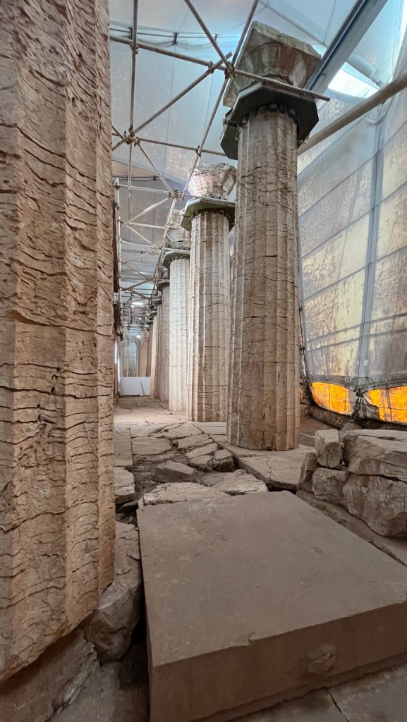 Du dorique donc, un temple magnifique mais emballé comme nous protégeons certains de nos glaciers, pour que les générations futures puissent en profiter.