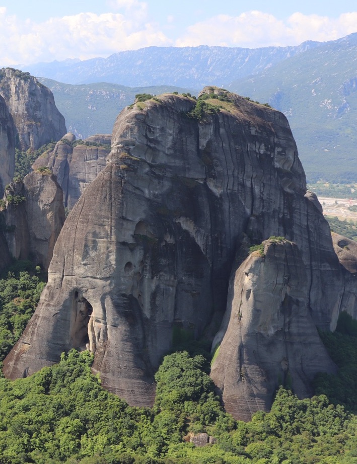 Alors comment que quoi comment ? Et bien les sédiments et ces fameux petits galets, purs produits du Tertiaire, ont été accrétés par un affluent de la mer de Thessalie, bien avant la formation de la péninsule hellénique qui, détournant cet affluent de son droit chemin, a mis une telle pression sur ces alluvions qu’ils en ont été tout métamorphisés (oui oui ,-phisés, pas -phosés, on parle de roches là, pas d’entités du règne végétal ou animal, qui eux peuvent -phoser), puis poussés en hauteur par le plissement du terrain, et enfin érodés par les quelques millions d’années qui ont précédés l’arrivée de Sapiens, et donc des moines, et donc des cohues de touristes de l’empire du milieu.