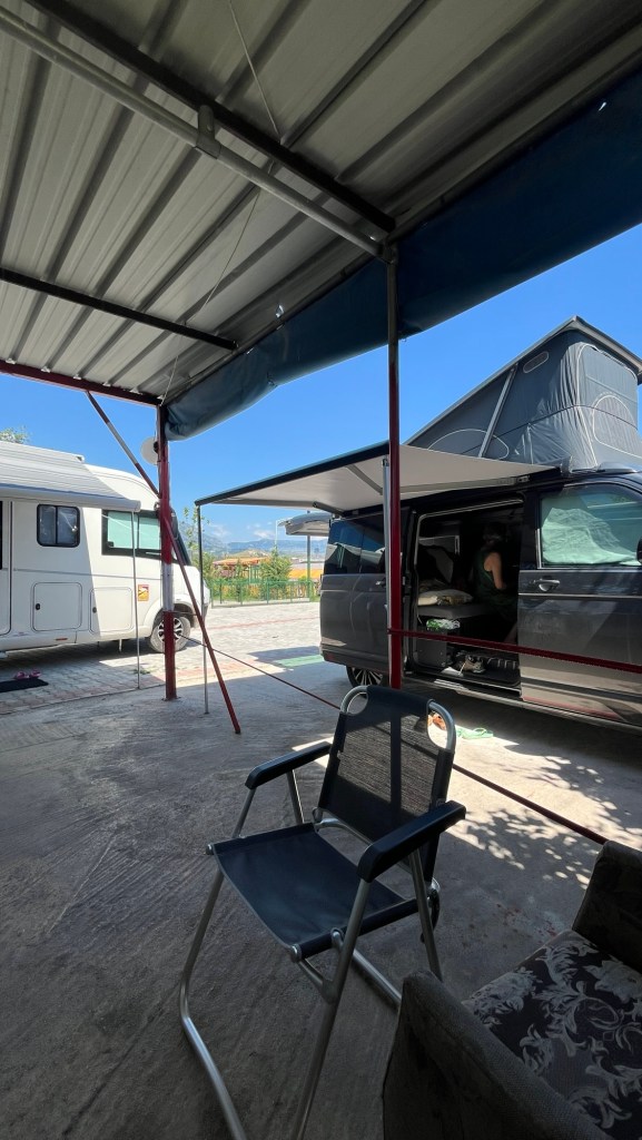 Jimmy a lui-même bâti et gère son camping, en fait un parking en béton, un peu aménagé, à côté d’un resto, en sortie de la ville, super propre, et un soin de tout les instants pour ses hôtes. Mais ça marche de mars à juin et de à septembre à novembre. Sinon trop chaud ou trop froid, personne, alors il manage aussi une dizaine de boutique dans le bazar de Gjirokaster, et sa femme, qui est employée aux finances de la ville, nettoie aussi les infrastructures du camping, Et lui fait aussi le taxi, à prix réduit, pour ses « campeurs ». Et le fiston, jeune ado, aide ses parent et les campeurs, quand il n’est pas à l’école.